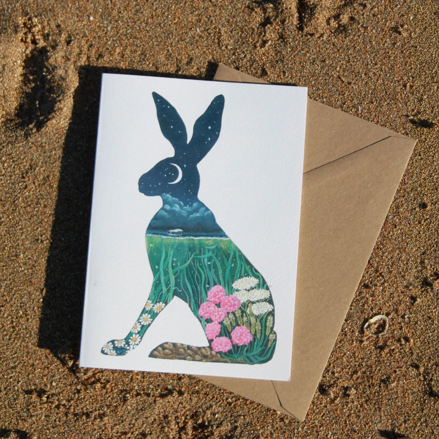 Full Moon and Crescent Moon Hare: greeting cards designed for Rock & Bird from an original mixed media paintings by Julia ZJ